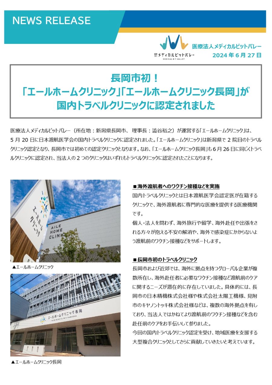 当法人が運営するエールホームクリニック(下柳)、エールホームクリニック長岡(長岡駅前)の両院が、日本渡航医学会の国内トラベルクリニックに認定されました。